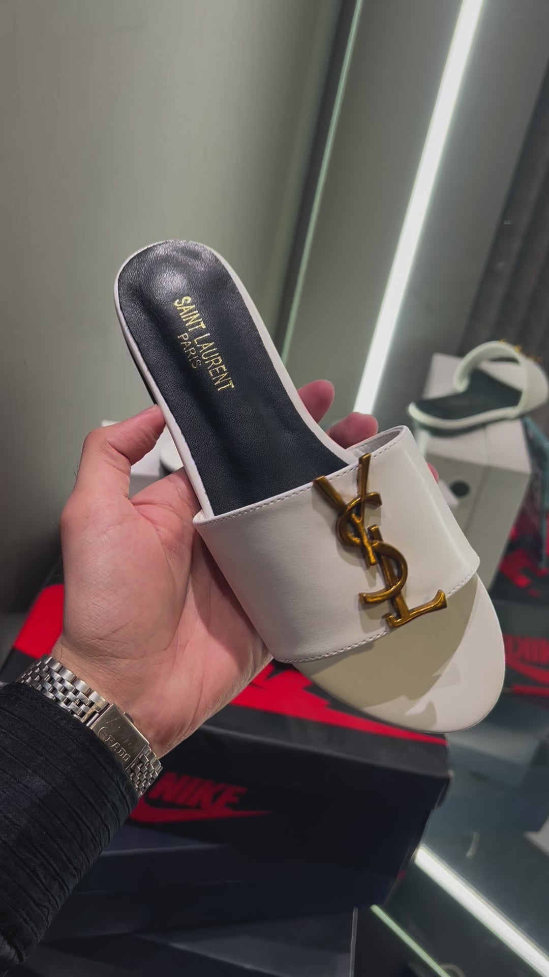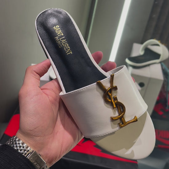 Saint Laurent White With Gold Logo Design Luxury Sendels With Og Dust Bag And Box
