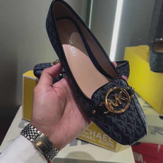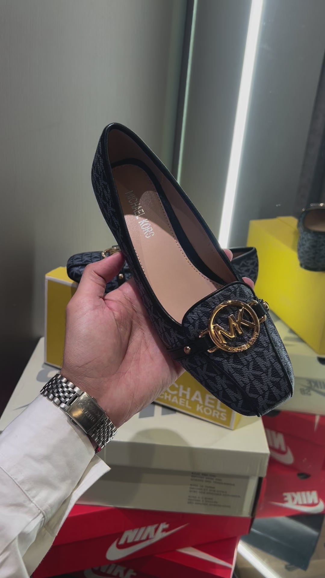 Michael Kors Dark Grey With Gold Logo Design Luxury Sendels With Og Dust Bag And Box