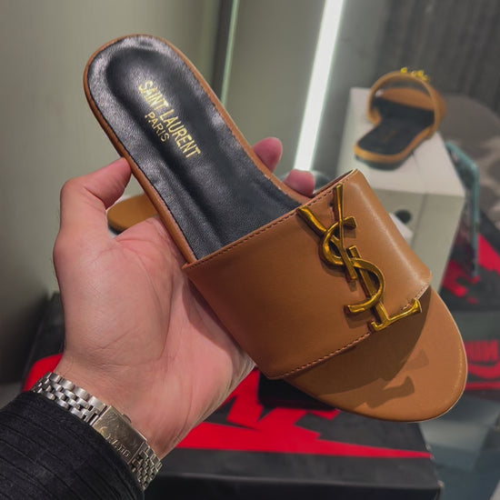 Saint Laurent Brown With Gold Logo Design Luxury Sendels With Og Dust Bag And Box